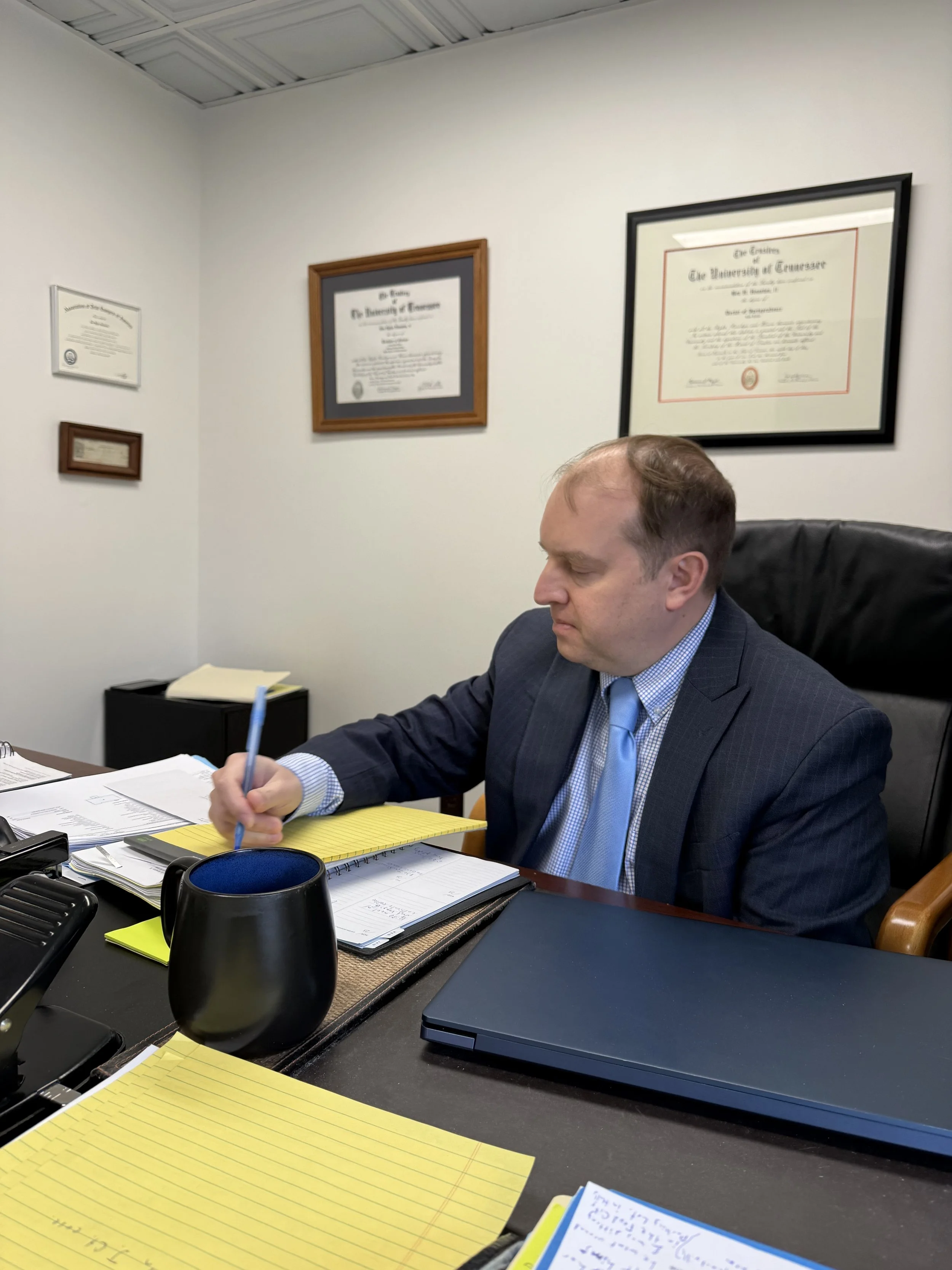 Ben grew up in rural East Tennessee and has spent his entire career serving the people of the greater Knoxville area. After graduating from Volunteer High School as Valedictorian, he attended the University of Tennessee at Chattanooga, where he earned his Bachelor of Science in Political Science and graduated Summa Cum Laude. He then attended the University of Tennessee College of Law. Shortly after earning his Doctor of Jurisprudence degree in 2004, Ben opened up his own law office and began working as a general practice attorney. He now has 21 years of experience practicing law in Knox County and surrounding counties.